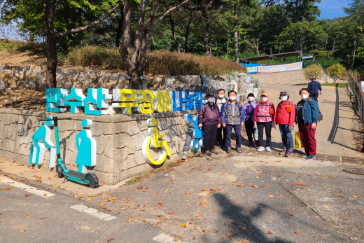 정상까지 2.15km로 왕복 4.3km이다. 얕은 산이지만, 등산길은 여러 코스가 있어 찾는 사람이 많다. 탐사대는 평균 연령이 74세라 무리하지 않고 무장애 길로는 가장 길다는 덱 길을 택했다. 올해 초 개통한 곳이라 아직도 곳곳에 보수 공사하는 곳이 많다. 만수 2경 바람의 계곡에는 “힘내라 빛나는 내 인생”이라 쓴 앙증맞은 삼각 현수막이 걷는 이를 격려한다.
