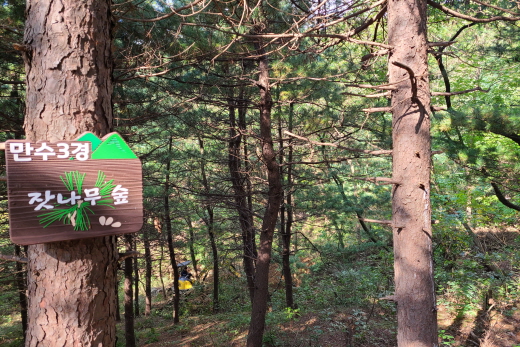 만수 3경 잣나무 숲을 들어서니 길게 자란 잣나무 군락이 힐링을 준다. 걷는 내내 생각보다 숲이 깊고 풍성해서 좋았다. 걷기 지루할 만하면 역시 삼각 플래카드가 힘을 준다. “항상 좋은 일만 있길” 이 마음 씀씀이가 주민들에 대한 배려인 것 같다. 만수 4경 삼둥이(세쌍둥이) 나무를 지나면 중간 쉼터로 넓은 휴게소가 있다.
